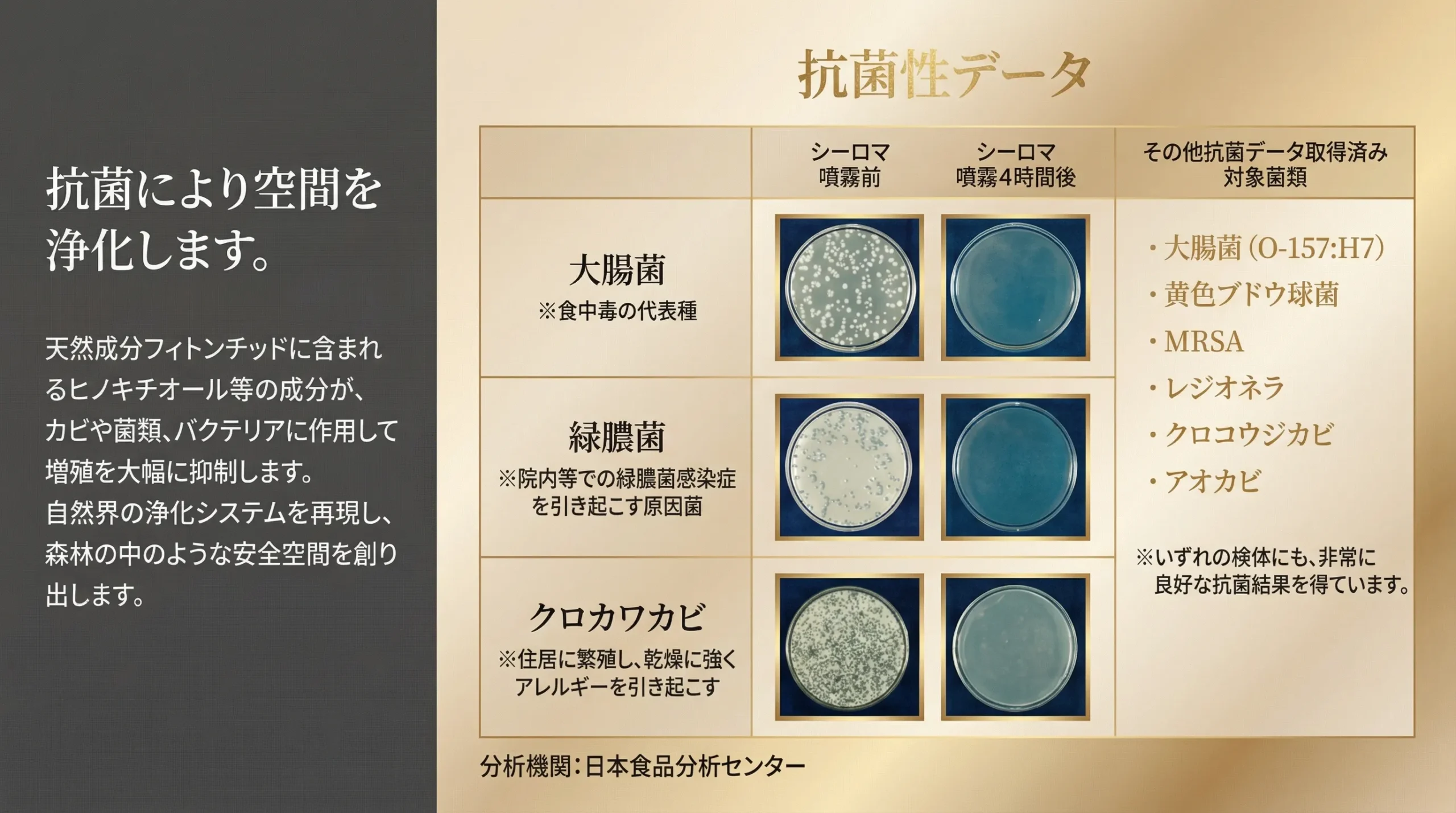フィトンチッド由来成分が、菌やカビの増殖を抑える働きを示しています。