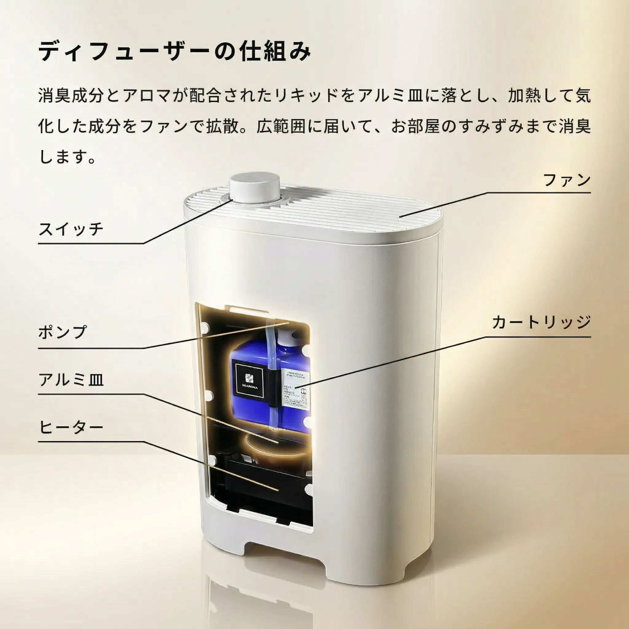 ファンで拡散することで、広範囲に届き、空間全体へ静かに行き渡らせます。