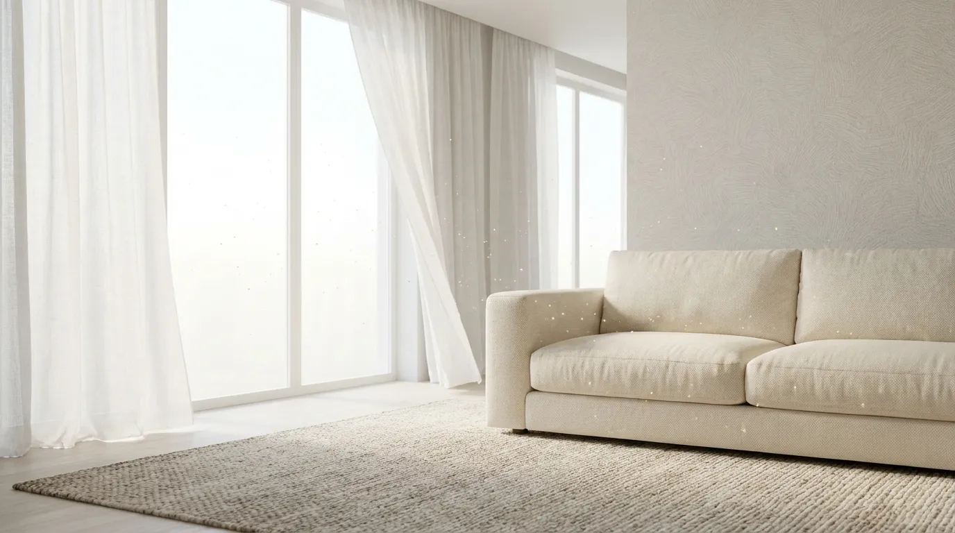 カーテンやソファ、壁紙、カーペットなどの繊維や素材に付着しています。